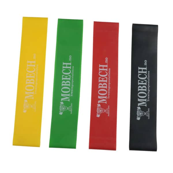Mobech ministrikk er optimale til bruk av rehabilitering styrke av stabiliserende muskler ""finisher"" for en ekstra pump eller for å legge på ekstra motstand i øvelser hvor du ikke ønsker å bruke vektskiver og apparater. Disse passer ypperlig både til bruk hjemme men kan også fint brukes på treningsstudio som supplerende utstyr. Mobech ministrikk kan du både bruke strikkene til oppvarming men også til selve øvelsene. Prøv de f.eks til disse øvelsene: Monsterwalk Glute bridge Hip abduction Reverse flyes Rundt albuer til hjelp i pushups Og mye mer! Gul = Lett Grønn = Medium Blå = Hard Sort = X-hard Ved hjelp av disse kan du både trene rumpe lår skuldre bryst og rygg. Her er det kun fantasien som setter en stopper for deg og din trening! OBS: Rød er nå byttet ut med blå og gul er i nyere produksjon blitt til medium styrke Design kan variere fra bildet"